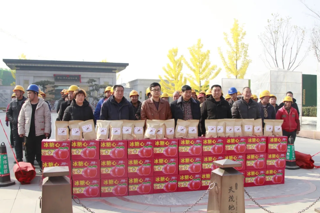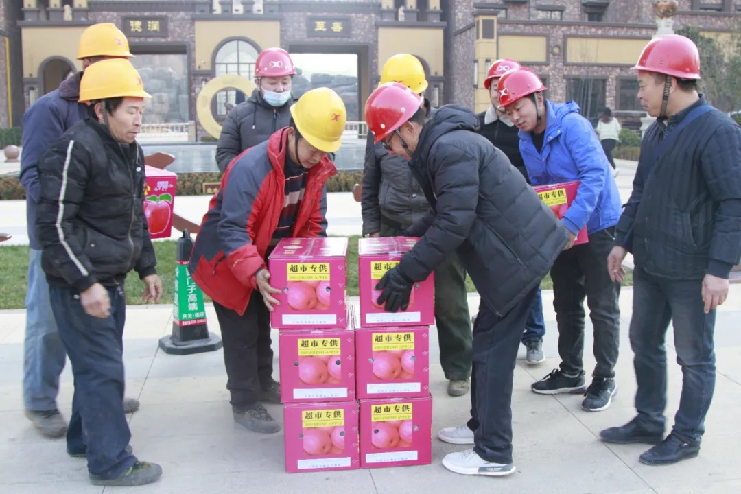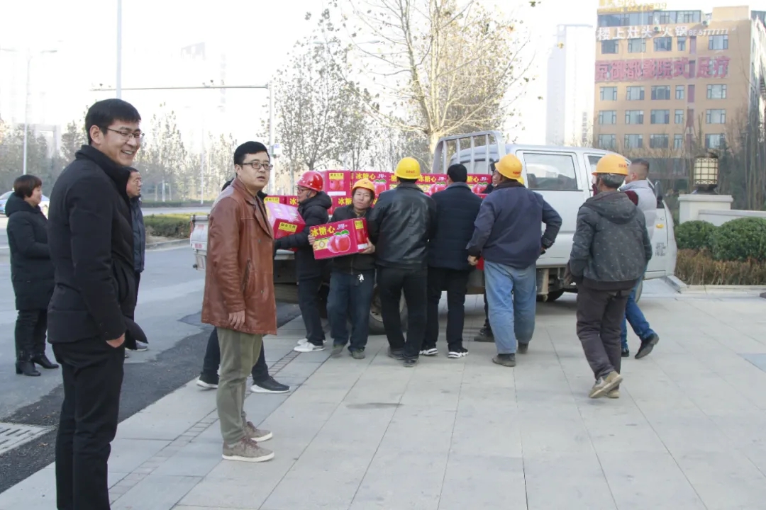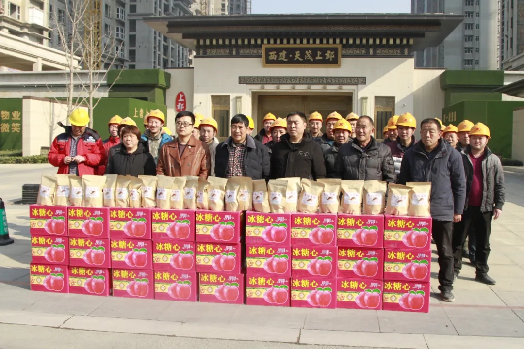 天茂房產分公司總經理劉忠森接過村干部帶來的柿餅,拆了一袋,分給現場的員工們,高興的說:“這是我們家鄉的柿餅,大家都應該嘗一嘗。”他說“非常感謝朱陽村干部們對西建集團的認可,帶來家鄉的蘋果和柿餅慰問咱們的農民工兄弟,讓大家伙心里很暖,寒冬不再冷!”