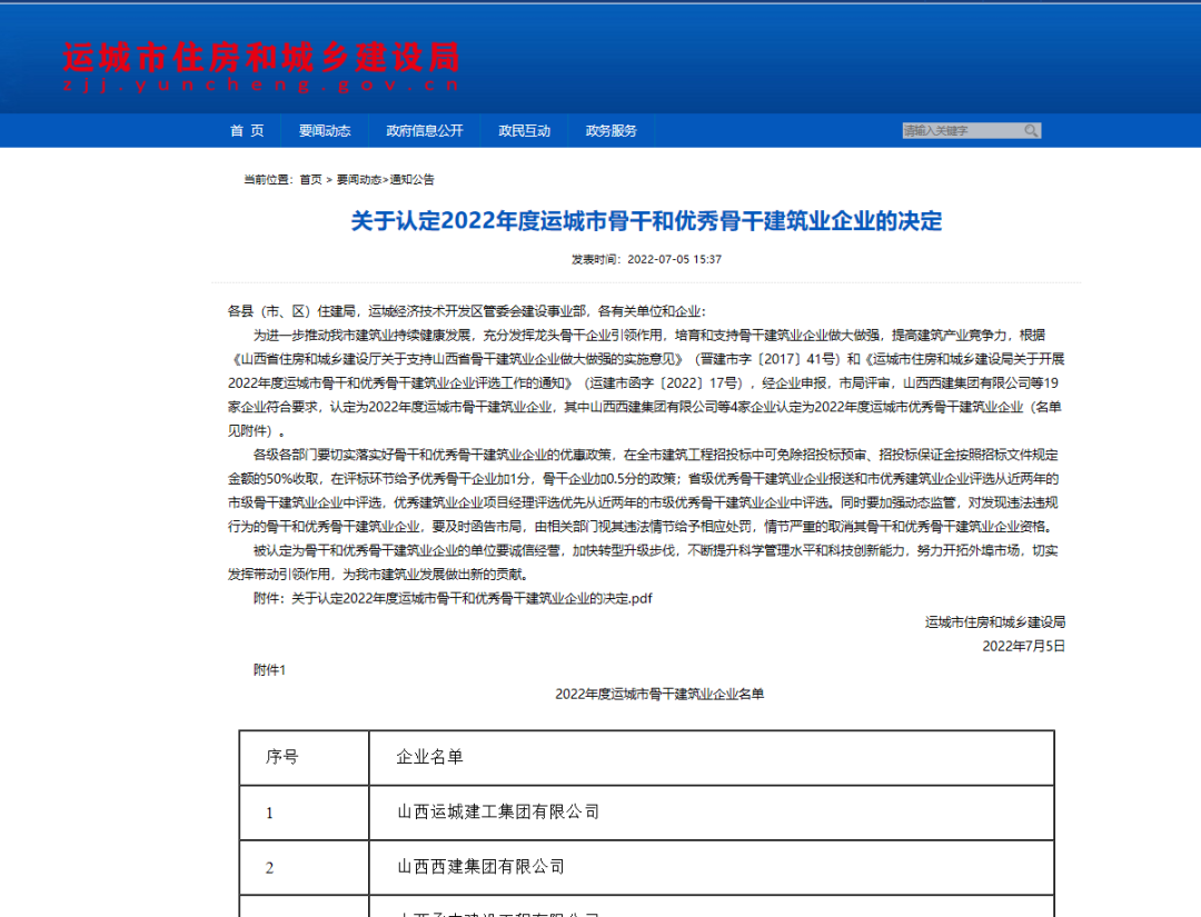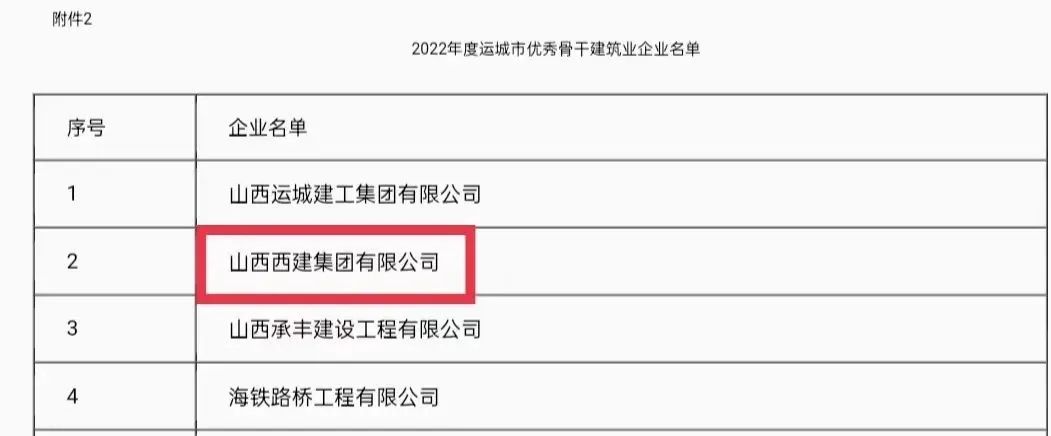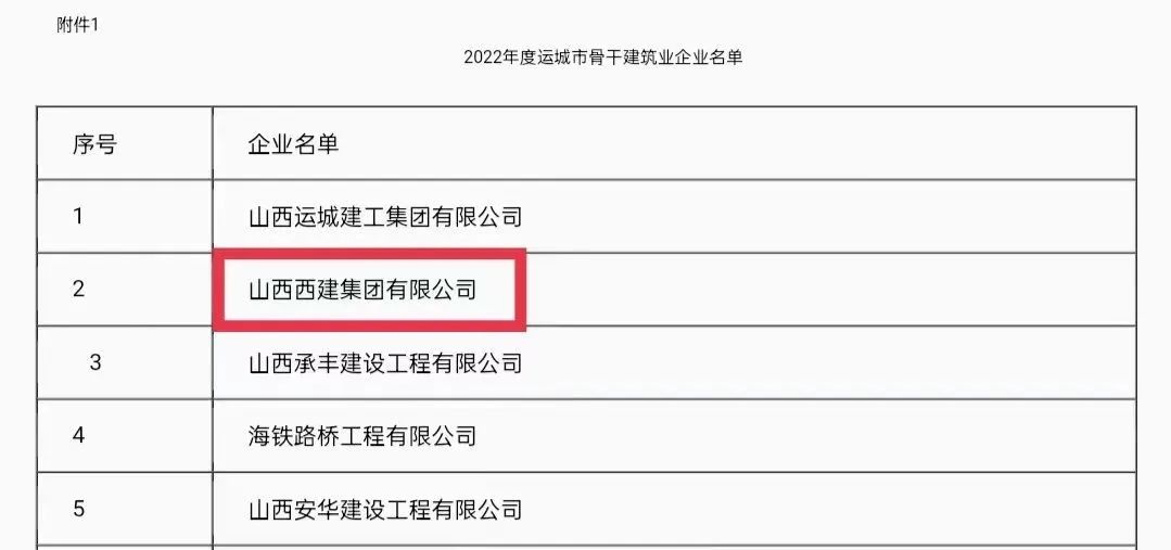 近日,從運城市住房和城鄉(xiāng)建設局傳來喜訊,山西西建集團有限公司憑借雄厚的實力和突出的業(yè)績,一舉斬獲“2022年度運城市骨干建筑業(yè)企業(yè)”和“2022年度運城市優(yōu)秀骨干建筑業(yè)企業(yè)”雙重稱號。