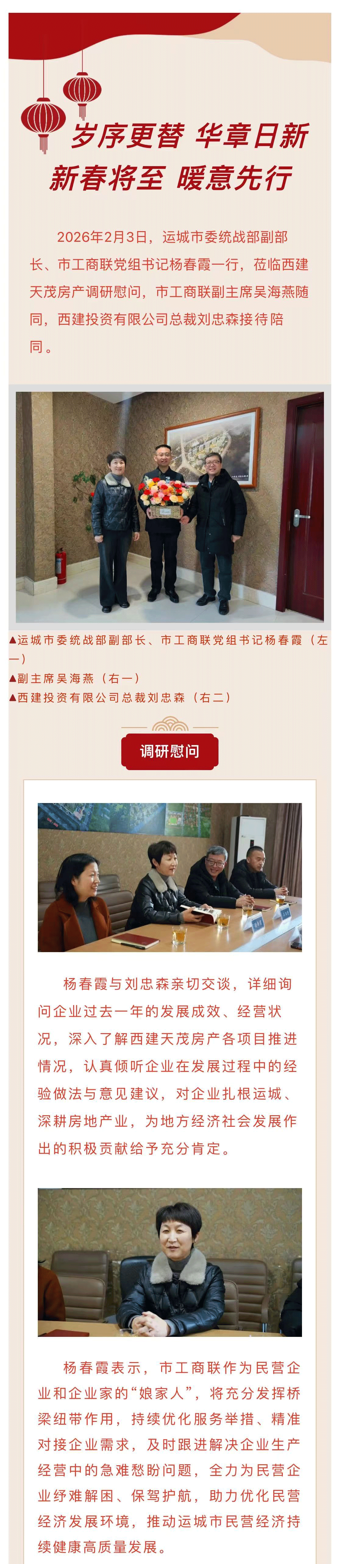 運城市委統(tǒng)戰(zhàn)部副部長、市工商聯(lián)黨組書記楊春霞一行蒞臨西建天茂房產(chǎn)調(diào)研慰問